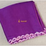 Plain Purple modal silk saree with needle Shibori on border and tie and dye patterns on pallu. Pallu has a big needle Shibori flower motif.