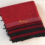 Saree: Beautiful dark Red hand-woven Ilkal pure Cotton Saree with traditional Gayathri Border on black base and black tope teni pallu. The Saree has white horizontal thin stripes. The saree body is pure cotton, Border and pallu are in silk.