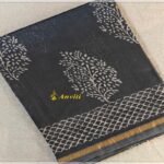 Slate grey color handblock printed Chanderi cotton silk saree with running blouse piece. The saree has a thin gold zari border. White motifs are handblock printed on the saree and throughout the border line. The running grey plain blouse piece has block printed border with thin zari line.