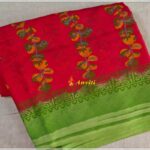Very soft, Easy to drape leheriya georgette saree in bright tomato red color. Beautiful floral handblock prints and borderline are all over the saree. The saree has parrot green border and pallu with handblock prints. The contrast parrot green blouse piece has one side border block prints.