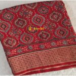 Ajrakh handblock printed Maroon Dola Silk saree with gold zari woven border. The Maroon red blouse piece has gold zari buttas and border with Ajrakh handblock prints.