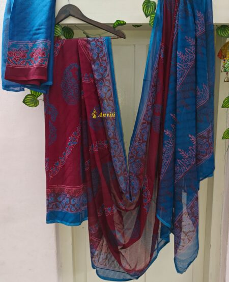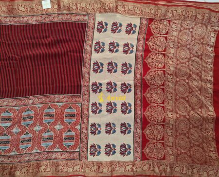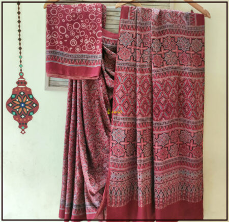 Maroon Gajji Silk Ajrakh Handblock printed Saree with running maroon blouse piece