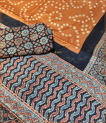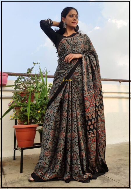 Black Modal Silk Ajrakh Handblock printed Saree with running black blouse piece