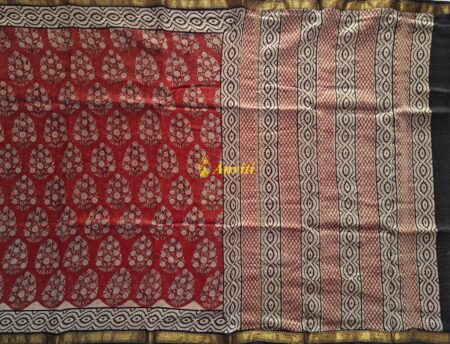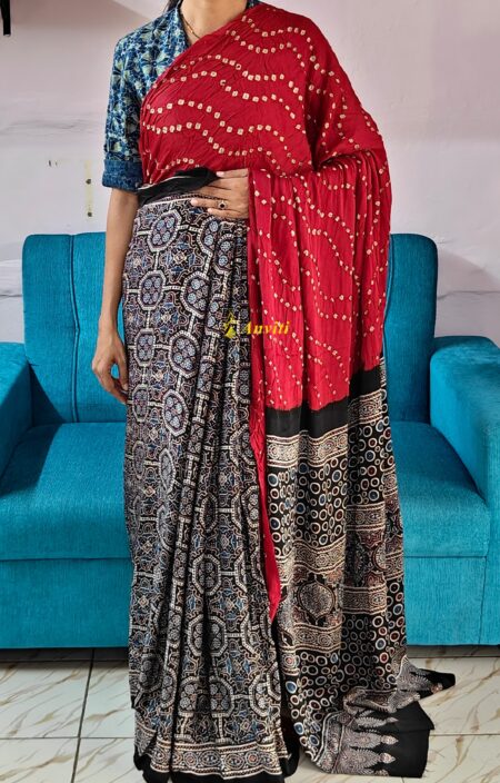 Ajrakh handblock printed and handmade Bandini Modal Silk saree in Black and Maroon combination.