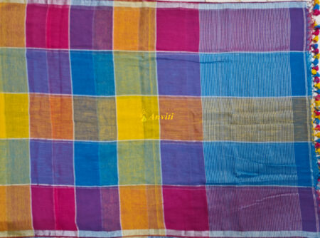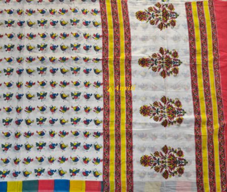 Multi Color Bird Handblock Printed Mulmul Cotton Saree with cotton blouse piece.