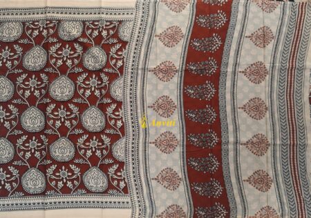 Maroon handblock printed mulmul cotton saree with white blouse piece.