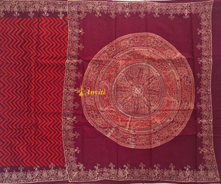 Maroon Block Printed Mulmul Cotton Saree with running blouse piece.